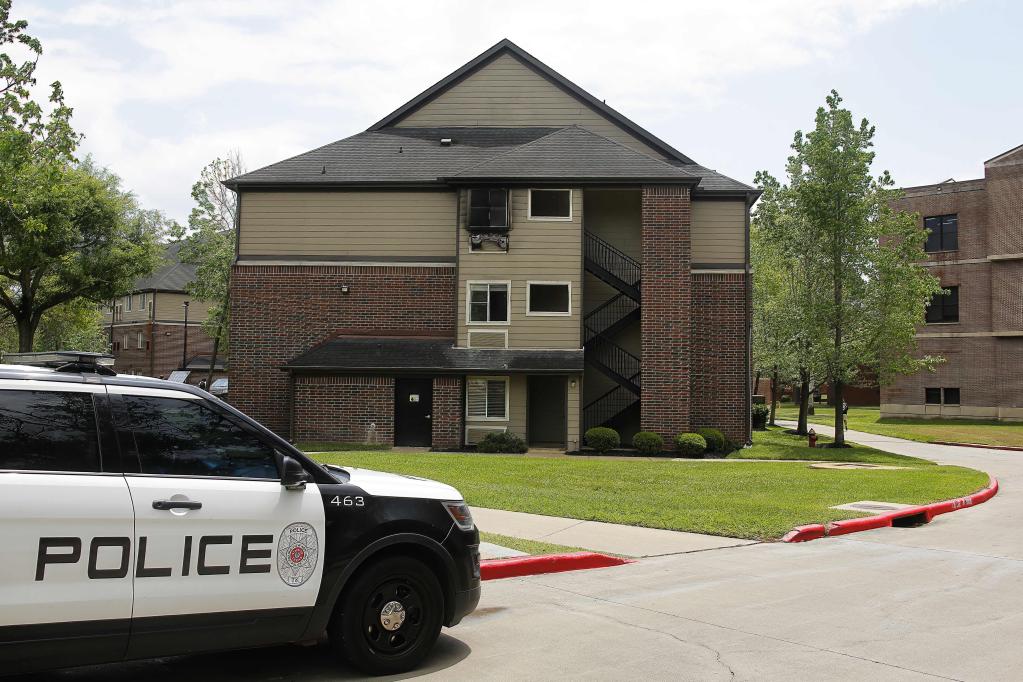 4月20日,在美国得克萨斯州普雷里维尤农业与机械大学,一辆警车停在发生火灾的宿舍楼前。新华社发(劳承跃摄)