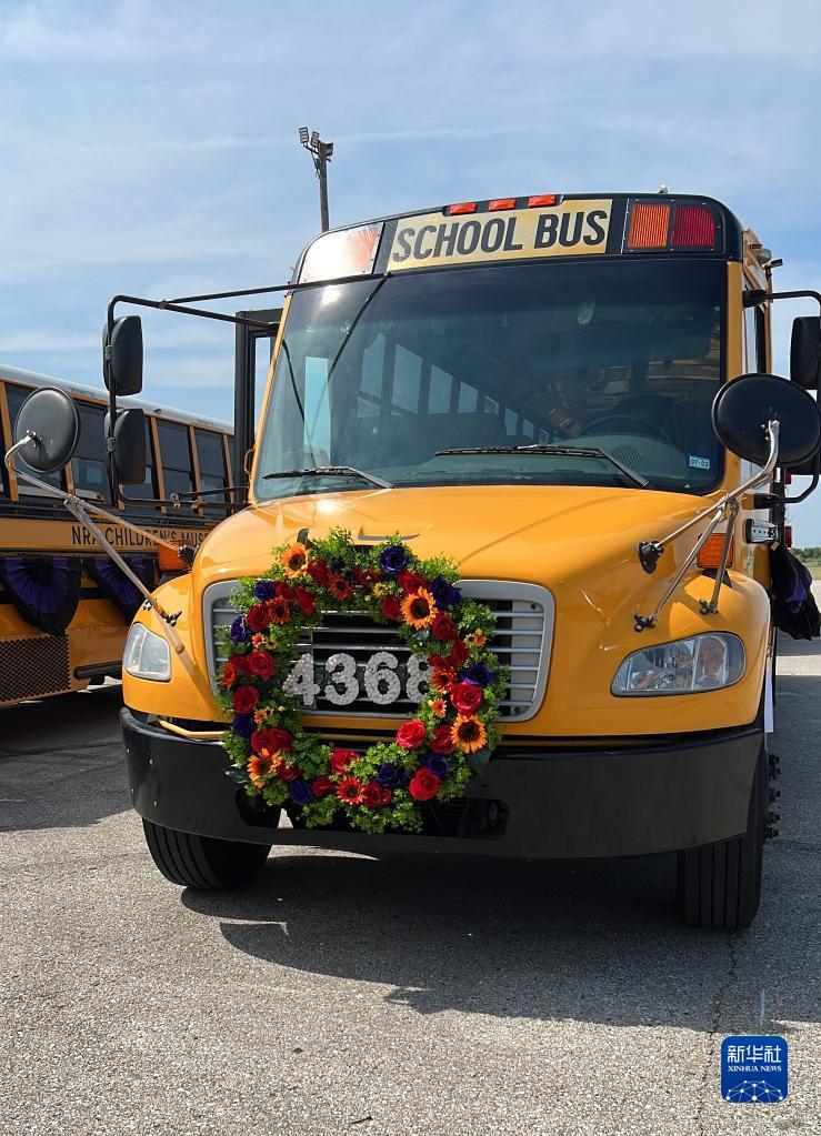 这是7月14日在美国得克萨斯州休斯敦拍摄的黄色空巴士。新华社发