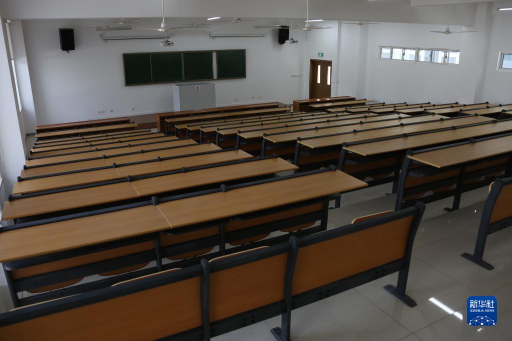 7月31日,在中国援建的阿富汗喀布尔大学综合教学楼和礼堂内,一间阶梯教室配备了投影、音响等多媒体教学设备。新华社发(塞夫拉赫曼·萨菲摄)