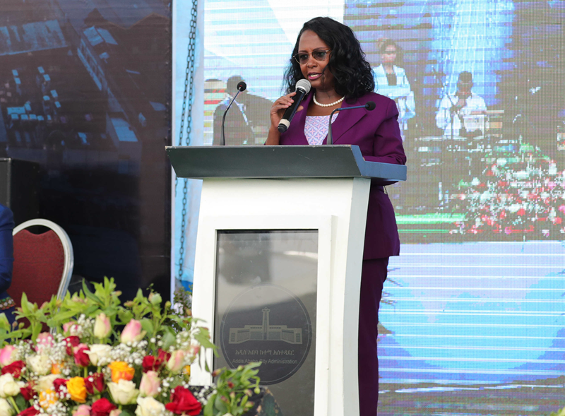 亚的斯亚贝巴市市长阿达妮奇·阿比比在竣工仪式上感谢中国对于普希金广场至高特拉立交桥市政道路项目提供建设帮助。