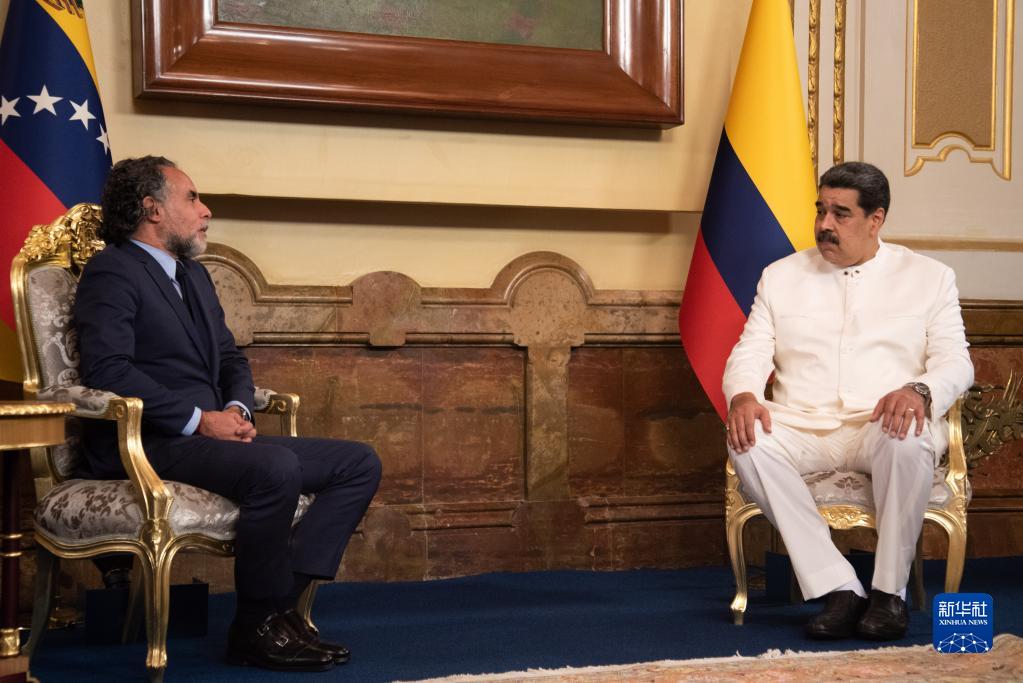 8月29日,在委内瑞拉首都加拉加斯,由哥伦比亚总统佩特罗任命的驻委内瑞拉大使贝内德蒂(左)与委总统马杜罗会晤。新华社发(萨尔戈多摄)