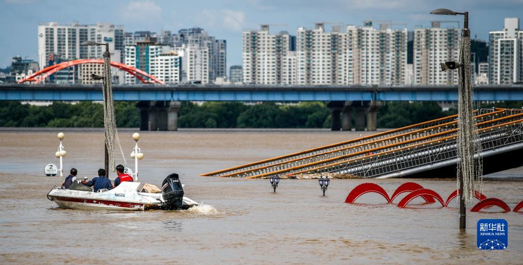 9月6日,在韩国首尔,工作人员乘快艇查看被水淹的汉江公园。