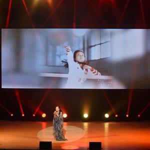 9月16日,在日本东京举行的纪念中日邦交正常化50周年晚会上,日本女演员荒木由美子演唱电视剧《排球女将》主题曲。新华社发(尚勇摄)