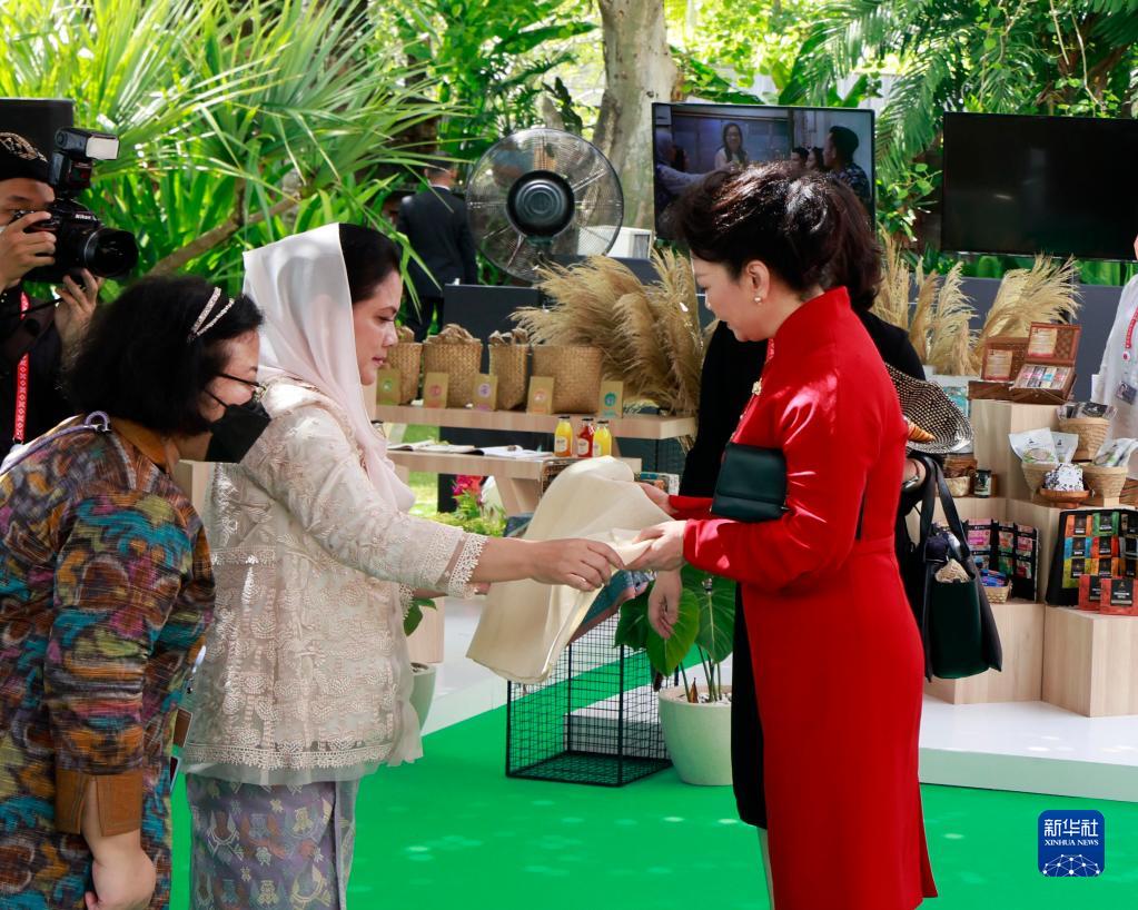 在伊莉亚娜陪同下,彭丽媛观看当地乐器、服饰、藤编、刺绣和生态食品展览,体验棕榈叶编织等印尼传统手工艺品制作。彭丽媛亲手在编织包上印上这次二十国集团领导人峰会标识和鲜花图案。彭丽媛赞赏印尼将手工艺品制作与妇女赋能、摆脱贫困和生态保护相结合的理念,表示两国可以在相关领域加强交流合作,为地区产业扶贫、生态保护贡献力量。