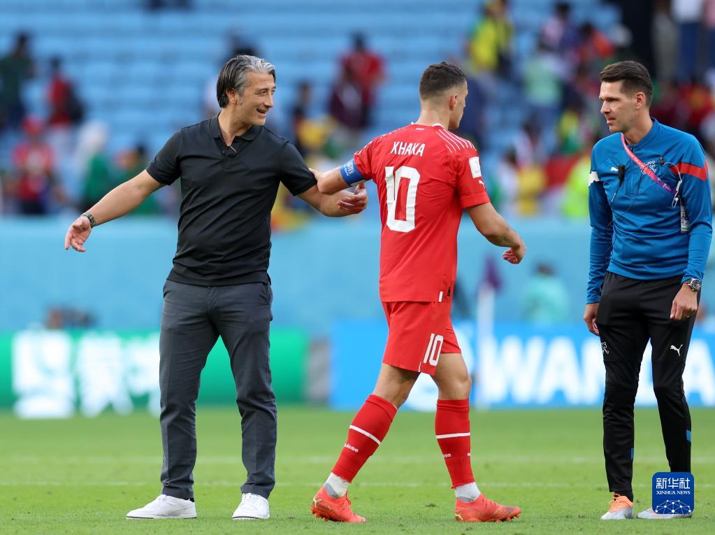 11月24日,瑞士队主教练穆拉特·亚金(左)与球员扎卡(中)在比赛后。