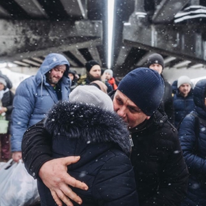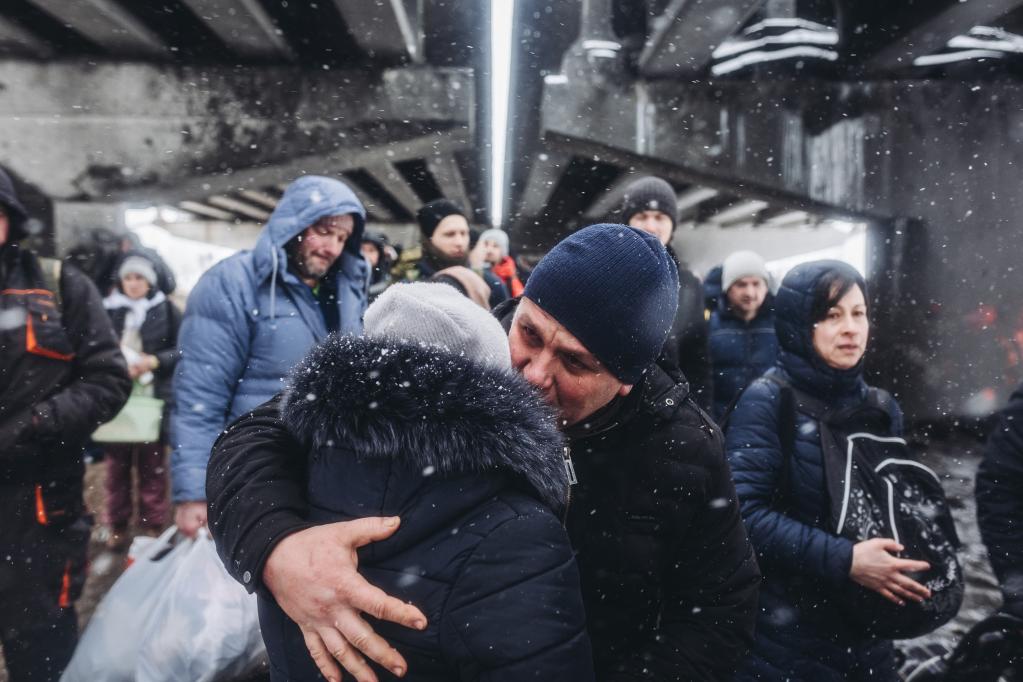 这是2022年3月8日,一对情侣在乌克兰伊尔平告别。俄方3月9日在乌克兰多个城市实行“安静模式”并开放人道主义通道。(新华社发,迭戈·埃雷拉 摄)