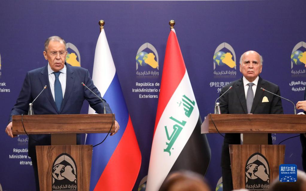 2月6日,在伊拉克首都巴格达,伊拉克外长侯赛因(右)与到访的俄罗斯外长拉夫罗夫出席联合新闻发布会。新华社发(哈利勒·达伍德摄)