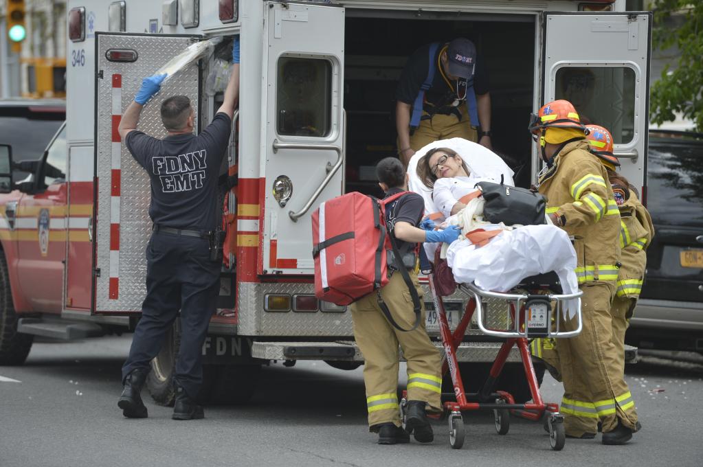 2014年5月2日,在美国纽约皇后区发生地铁列车脱轨的地段,一名受伤乘客被救援人员送上救护车。新华社记者王雷摄