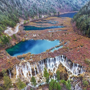 这是位于四川省阿坝藏族羌族自治州九寨沟景区的诺日朗瀑布及诺日朗群海(2018年11月6日无人机拍摄)。新华社记者刘坤摄