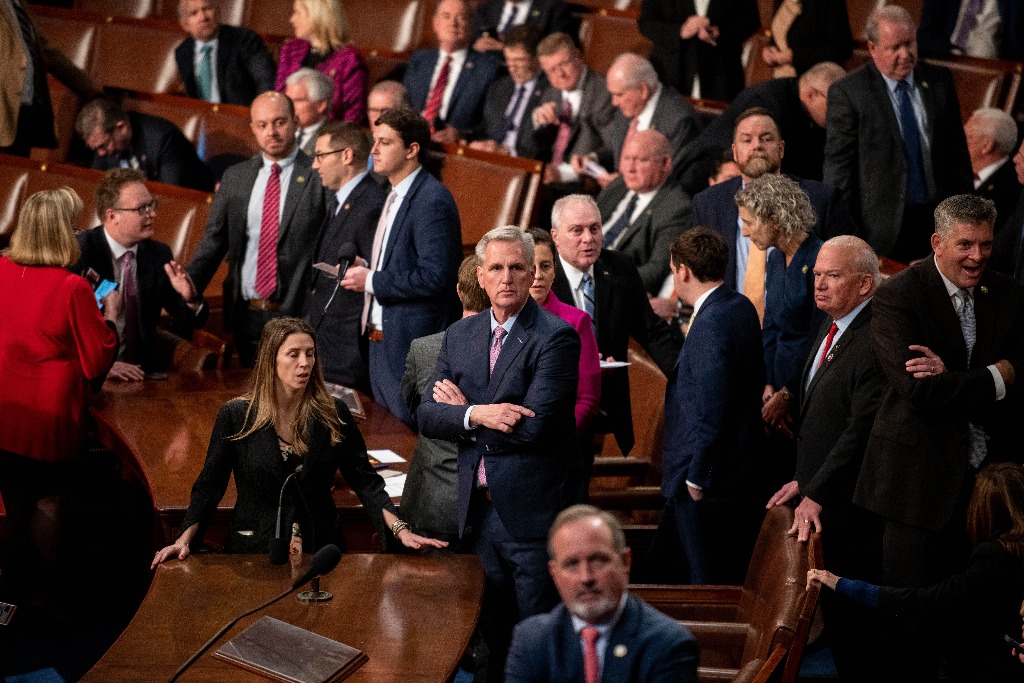 这是1月6日在美国华盛顿国会拍摄的凯文·麦卡锡(中)。经过党内激烈争论达成利益交换,共和党众议员凯文·麦卡锡于7日凌晨在第15轮众议院议长选举表决中当选议长。(新华社记者刘杰摄)