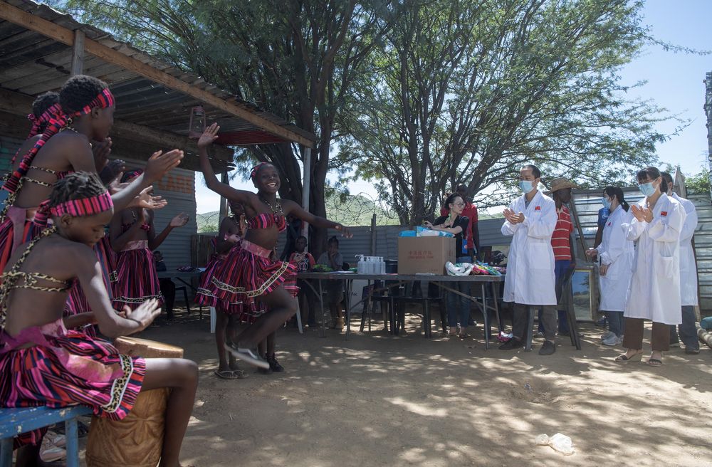 2023年2月16日,中国第14批援纳医疗队来到距纳米比亚首都温得和克市中心约20公里的弗兰斯艺术培训中心,对在此学习的学生进行健康检查。这是艺术培训中心的同学们用传统舞蹈感谢中国医生。新华社发(穆萨·卡萨克摄)