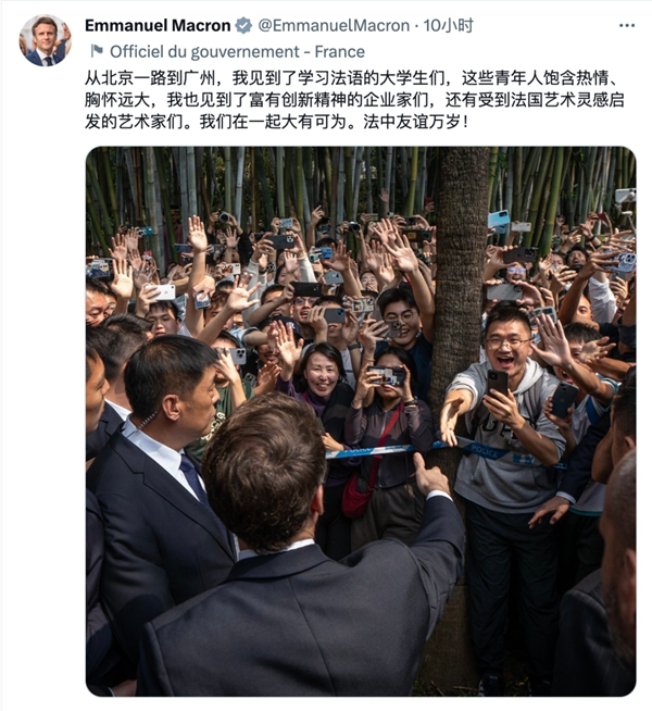 结束访问离开中国之际,马克龙连发四条推特,连说好几遍“法中友谊万岁”,激动之情溢于言表。