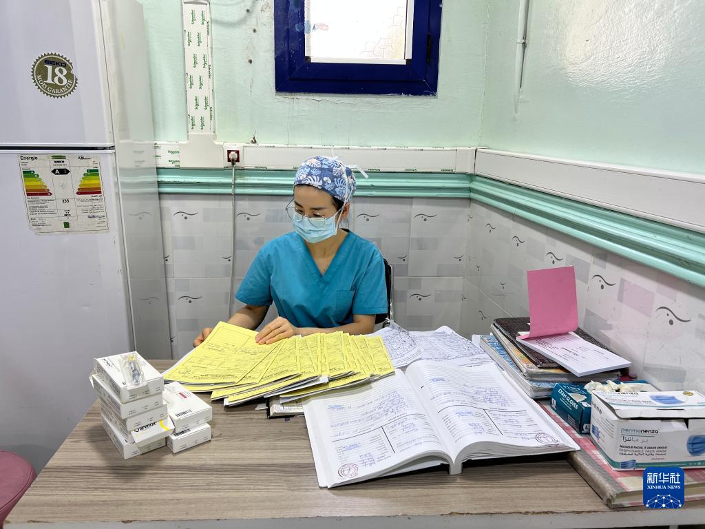 2022年5月6日,在阿尔及利亚赛伊达,中国援阿医疗队妇产科医生吴姣姣查看患者病历(手机照片)。新华社发(中国援阿医疗队供图)