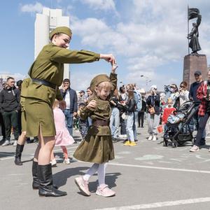 5月9日,在俄罗斯符拉迪沃斯托克,身穿模仿二战时期苏军军服的市民在广场上跳舞。新华社发(郭飞洲摄)
