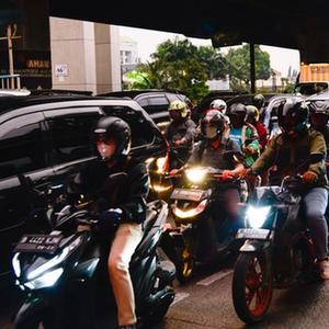 6月27日傍晚,在印度尼西亚雅加达东区的芝皮南切姆佩达克,人们在雅加达-万隆出城方向的道路上骑行。