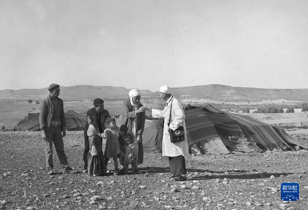 这张1965年的资料照片显示,中国援阿医生(右一)在阿尔及利亚赛伊达省为牧民诊治。新华社发(王南生 摄)