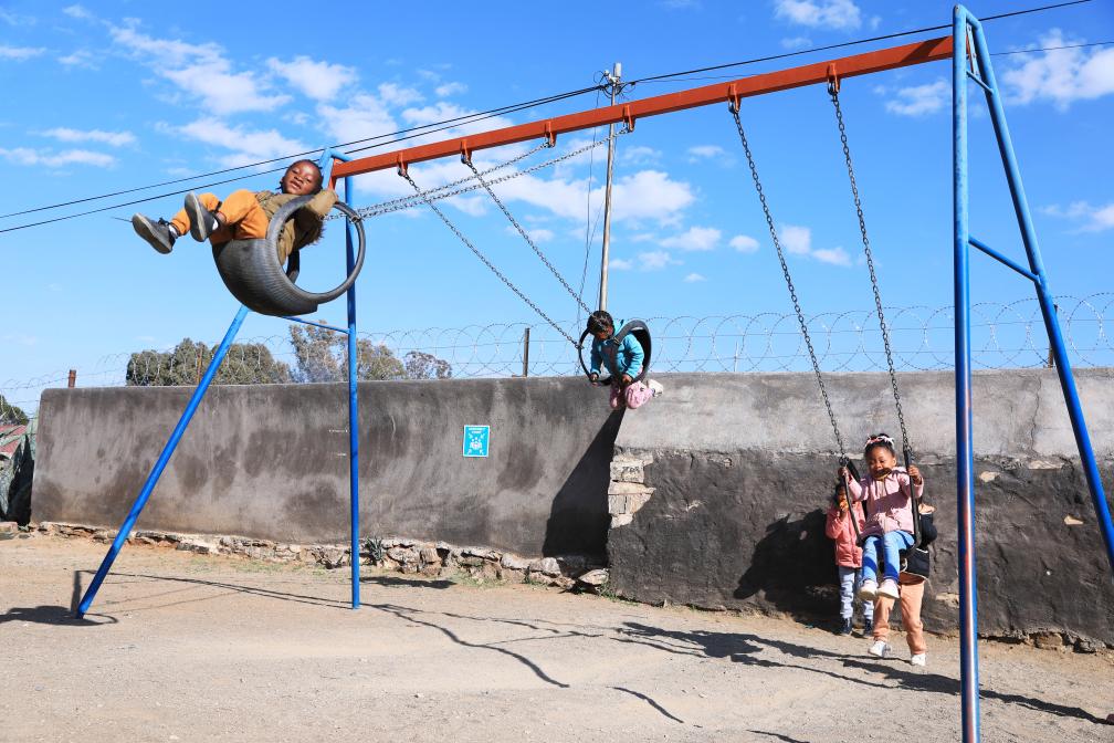 8月11日,孩子们在南非德阿镇的一家儿童早教中心荡秋千。这家早教中心由中国龙源南非公司出资成立运营。(新华社记者董江辉摄)