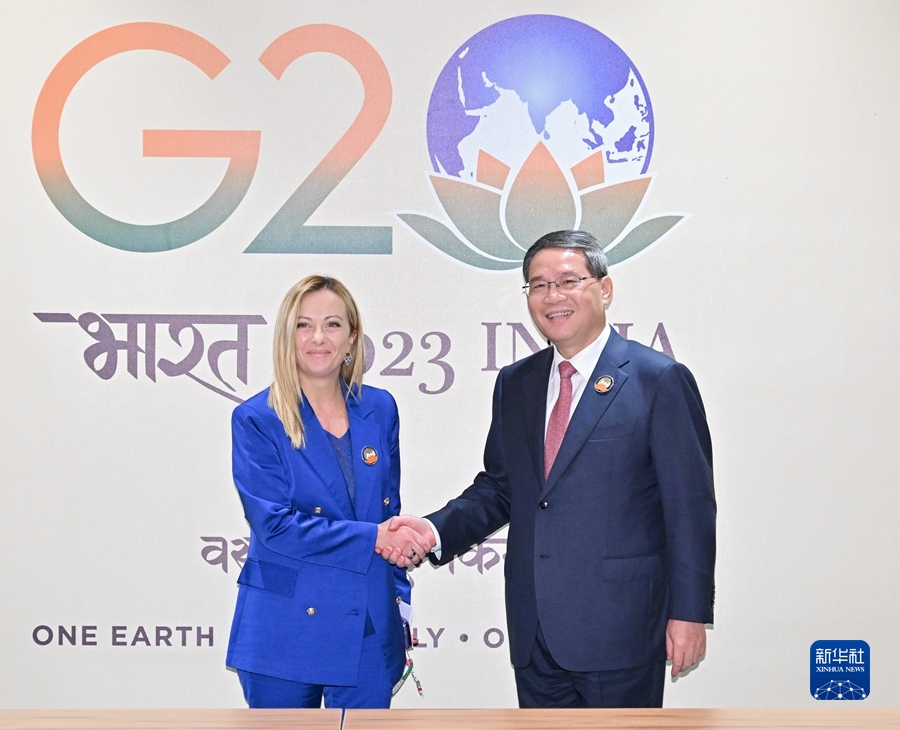 当地时间9月9日下午,国务院总理李强在新德里出席二十国集团领导人峰会期间会见意大利总理梅洛尼。新华社记者 岳月伟 摄