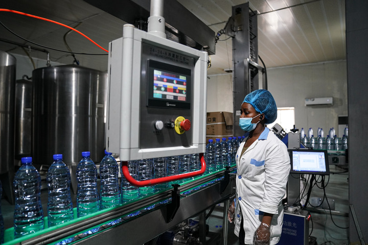 9月9日,当地员工在位于加蓬首都利伯维尔的欧来源纯净水厂生产线上工作。新华社记者韩旭摄
