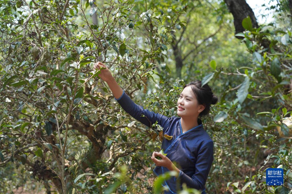 4月19日,当地村民在景迈大寨古茶林采摘春茶。新华社发(卢磊 摄)