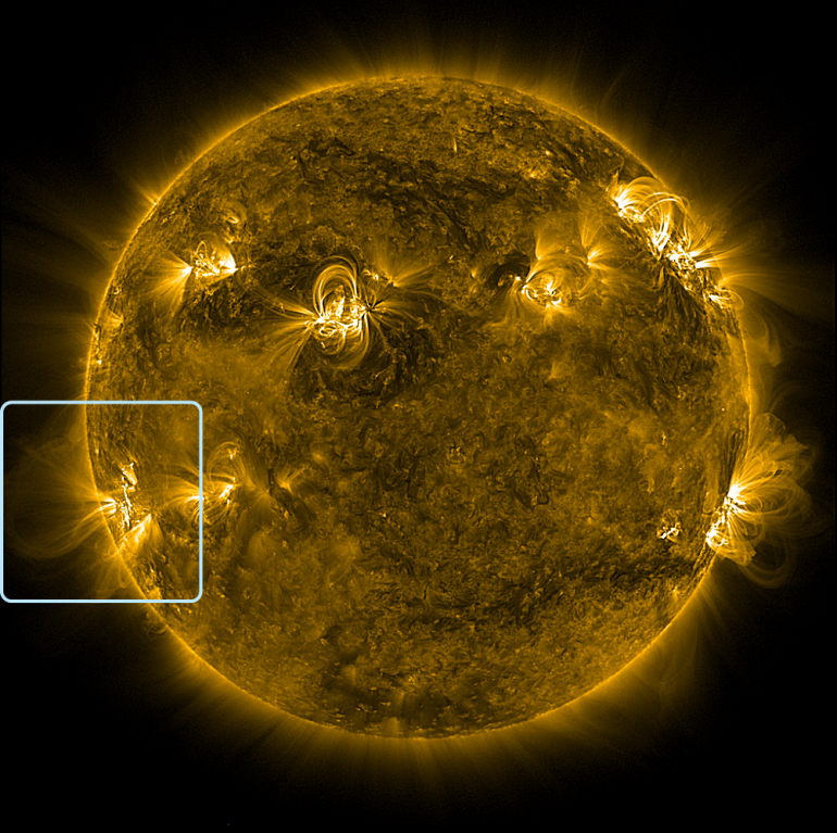 这张生成于2011年3月8日的太阳图片显示,在太阳表面上,有多个岛屿般的太阳活动区,活动区内延伸出无数半圆形磁力线,而可能引发太阳风暴的“磁绳”就发现于白色方框内的活动区。新华社发(美国航天局/乔治·梅森大学供图)