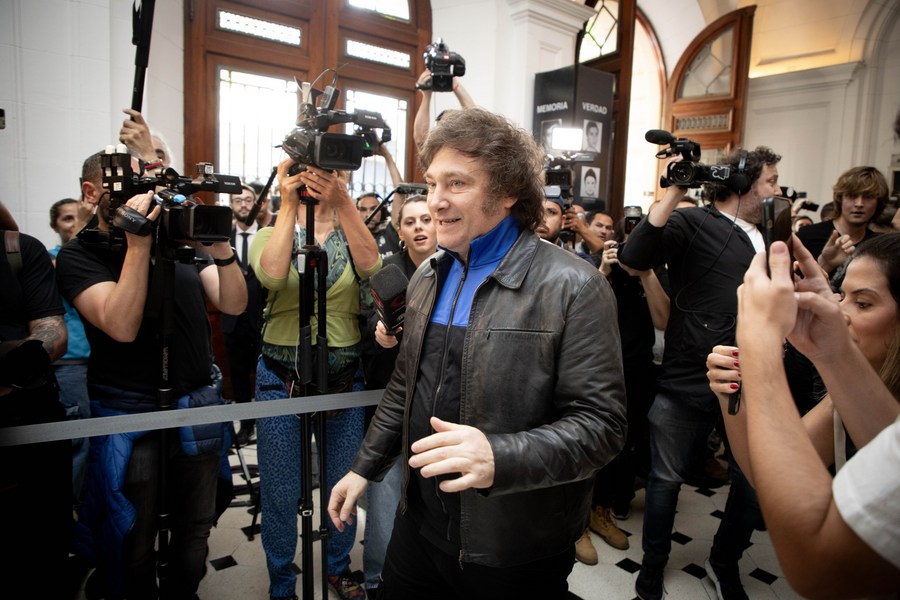 10月22日,阿根廷总统候选人哈维尔·米莱(中)在首都布宜诺斯艾利斯的一处投票站投票。(新华社发 马丁·萨巴拉摄)
