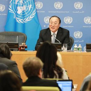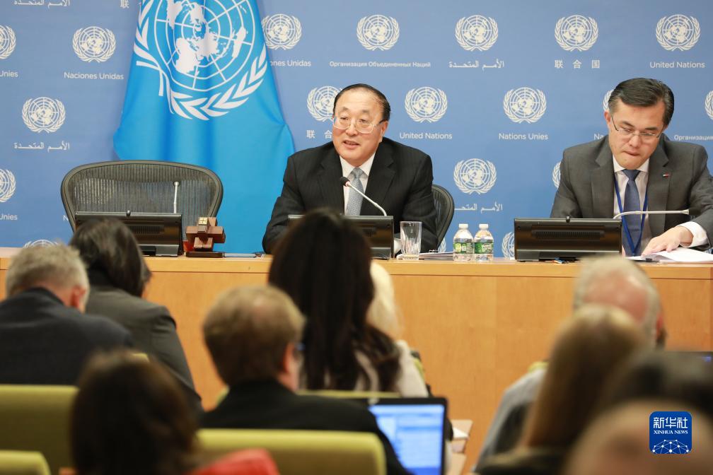 11月1日,在位于纽约的联合国总部,中国常驻联合国代表张军(左)在媒体吹风会上讲话。新华社记者 谢锷 摄
