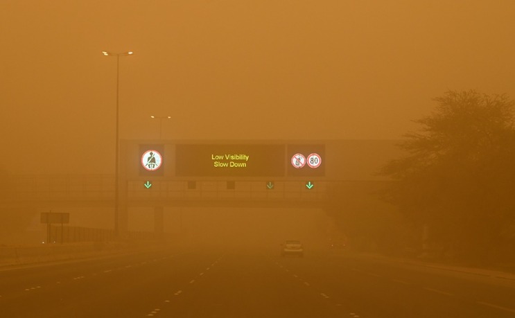 2022年3月4日,在科威特首都科威特城,汽车行驶在沙尘中。新华社发(阿萨德摄)