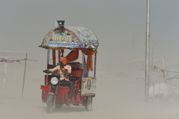 4月18日,在印度北方邦普拉亚格拉杰,一名男子冒着风沙出行。新华社发