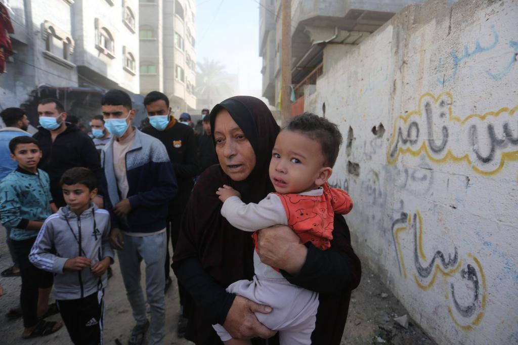 11月23日,人们聚集在加沙地带南部城市拉法一处废墟上。以色列国防军23日宣布,以军当天继续在加沙地带开展空中和地面军事行动,并在以北部与黎巴嫩方面发生交火。新华社发(哈立德·奥马尔摄)