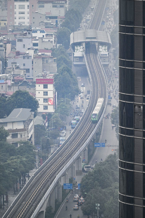 2023年12月9日,列车在越南河内吉灵-河东轻轨线上行驶。河内吉灵-河东线轻轨由中国中铁六局集团有限公司承建,是中越两国共建“一带一路”的标志性项目。新华社记者 程一恒 摄
