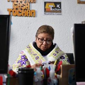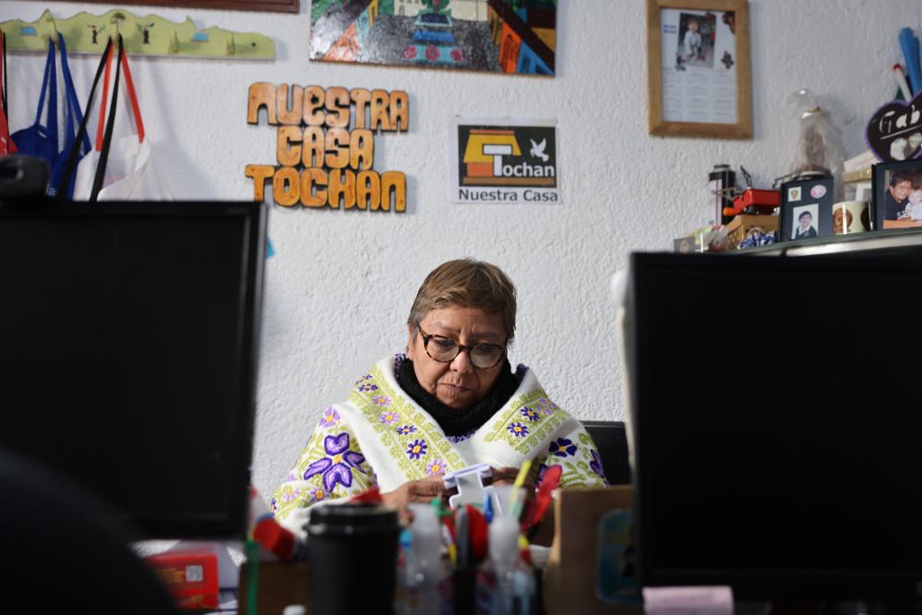 2023年12月14日,加布丽埃拉·埃尔南德斯在墨西哥城移民收容所“托阡之家”办公室内工作。新华社记者李梦馨摄