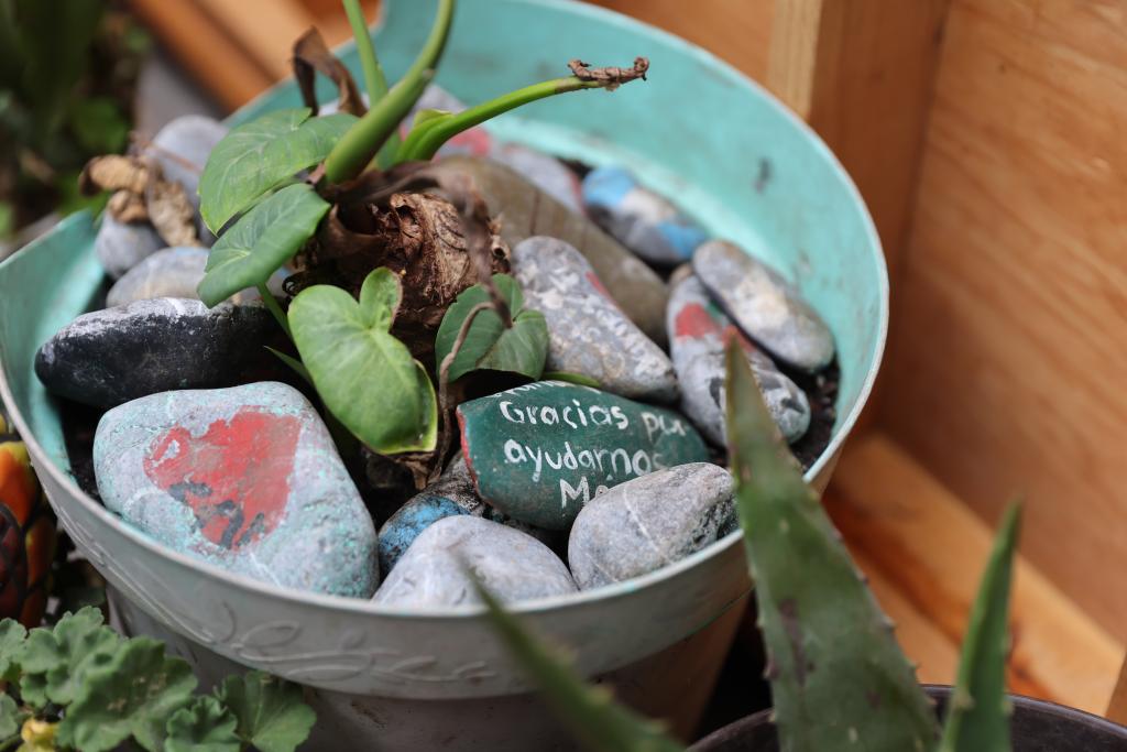 2023年12月14日在墨西哥城“托阡之家”拍摄的盆栽,石头上有人写下“感谢帮助我”的字样。新华社记者李梦馨摄
