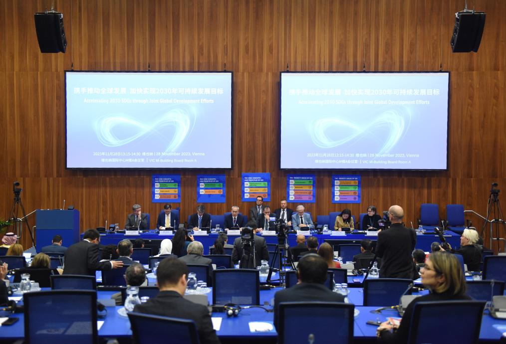 这是2023年11月28日在奥地利维也纳拍摄的“携手推动全球发展 加快实现2030年可持续发展目标”研讨会现场。新华社记者贺灿铃摄