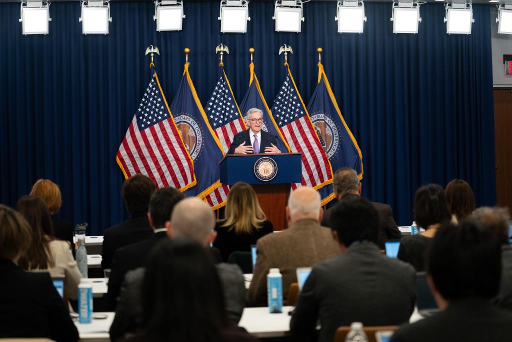 2023年12月13日,美国联邦储备委员会主席鲍威尔(后)在华盛顿出席记者会。新华社记者刘杰摄