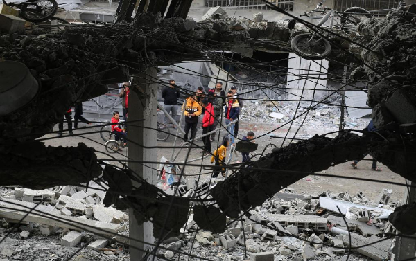 1月3日,在加沙地带南部城市拉法,人们查看以军空袭后的建筑废墟。新华社发(哈立德·奥马尔摄)