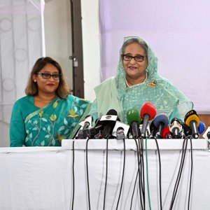 1月7日,在孟加拉国达卡的一个投票中心,孟加拉国总理哈西娜(左二)出席新闻发布会。新华社发