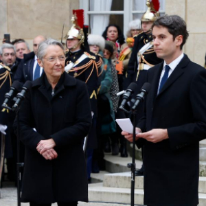1月9日,加布里埃尔·阿塔尔(前右)在法国巴黎总理府举行的权力交接仪式上致辞。新华社发(里特·埃斯摄)