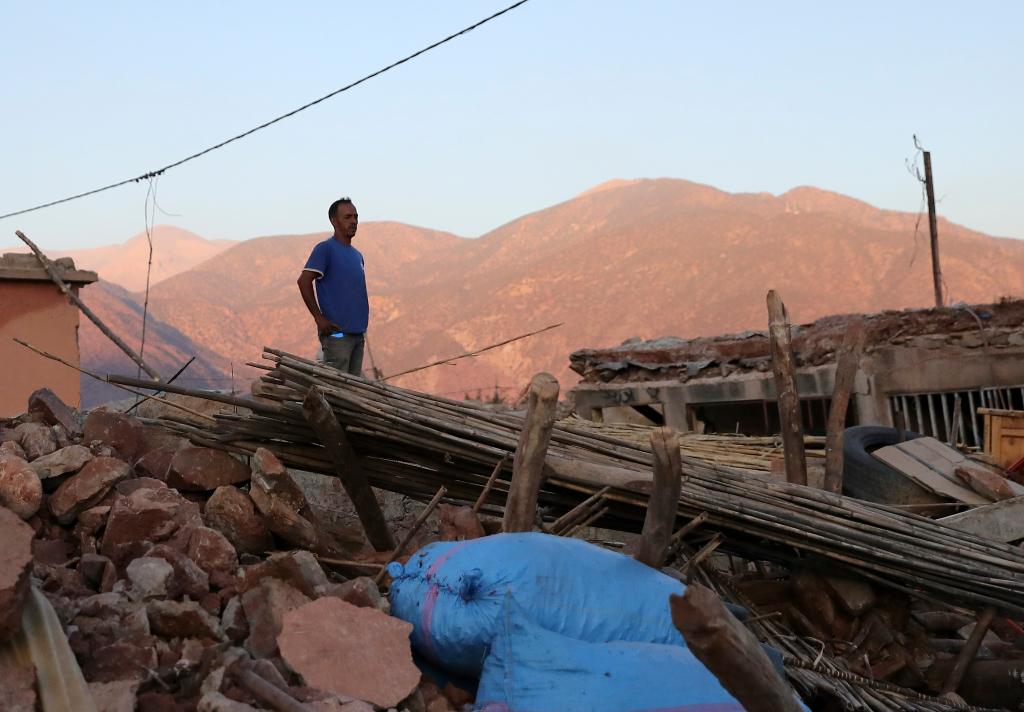 ↑2023年9月12日,在震中区域的摩洛哥豪兹省塔拉特恩雅库布村,一名男子站在废墟上。