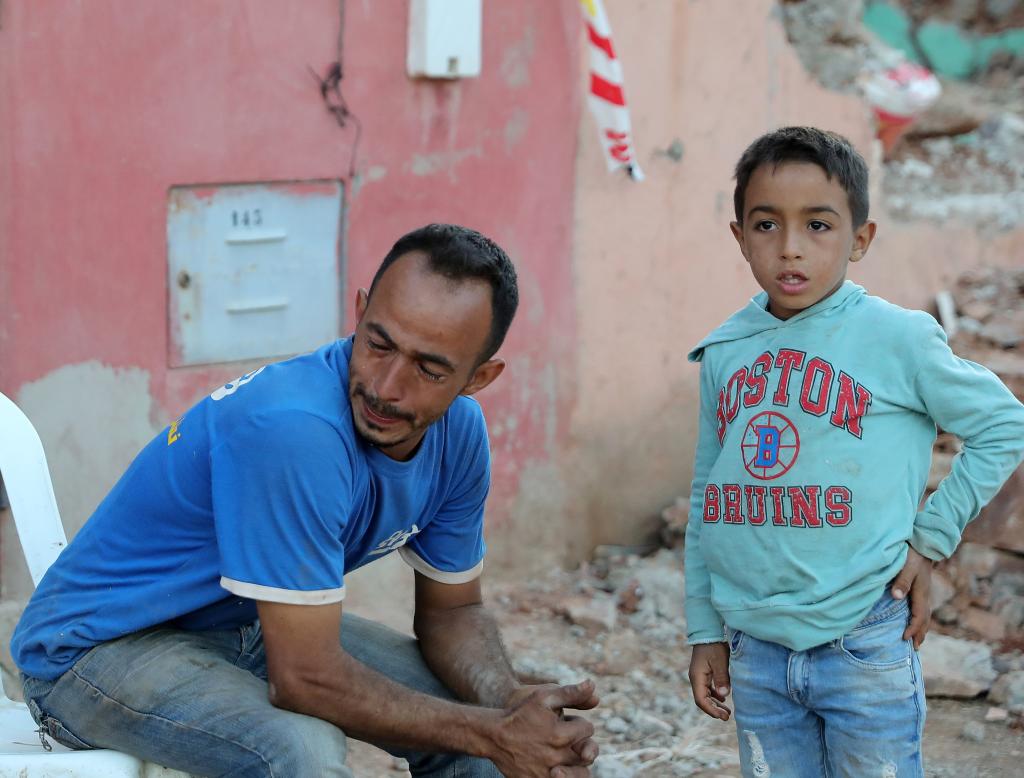 ↑2023年9月12日,在震中区域的摩洛哥豪兹省塔拉特恩雅库布村,一名男子坐在自己遭地震损毁的家前哭泣。
