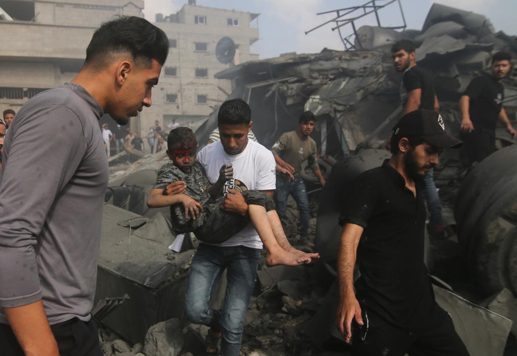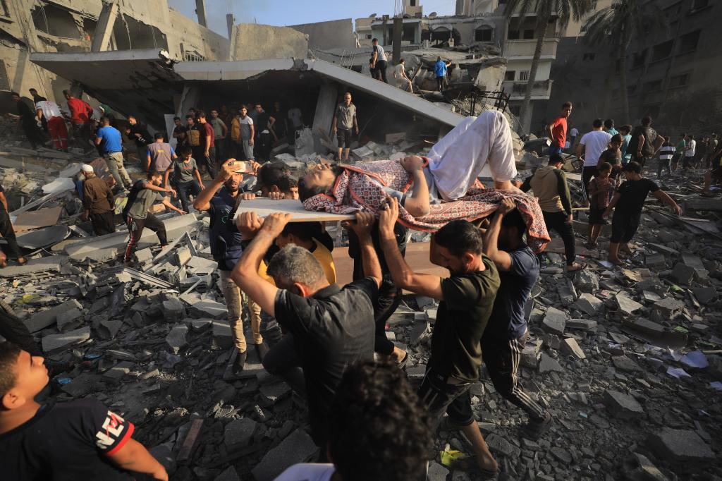 ↑2023年10月22日,在加沙地带南部城市拉法,人们在遭以色列袭击损毁的建筑废墟上救援。 新华社发(哈立德·奥马尔摄)