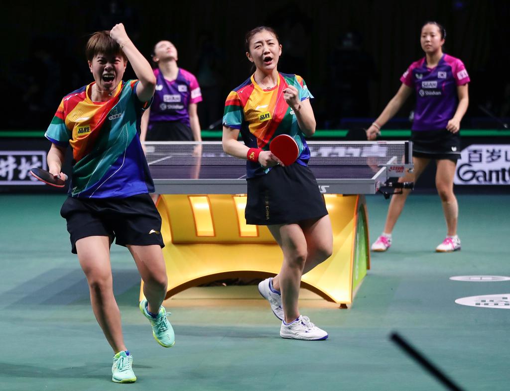 ↑2023年5月27日,陈梦(前右)/王艺迪(前左)庆祝得分。当日,在南非德班进行的2023年世界乒乓球锦标赛女子双打决赛中,中国选手陈梦/王艺迪以3比0战胜韩国选手田志希/申裕斌,夺得冠军。