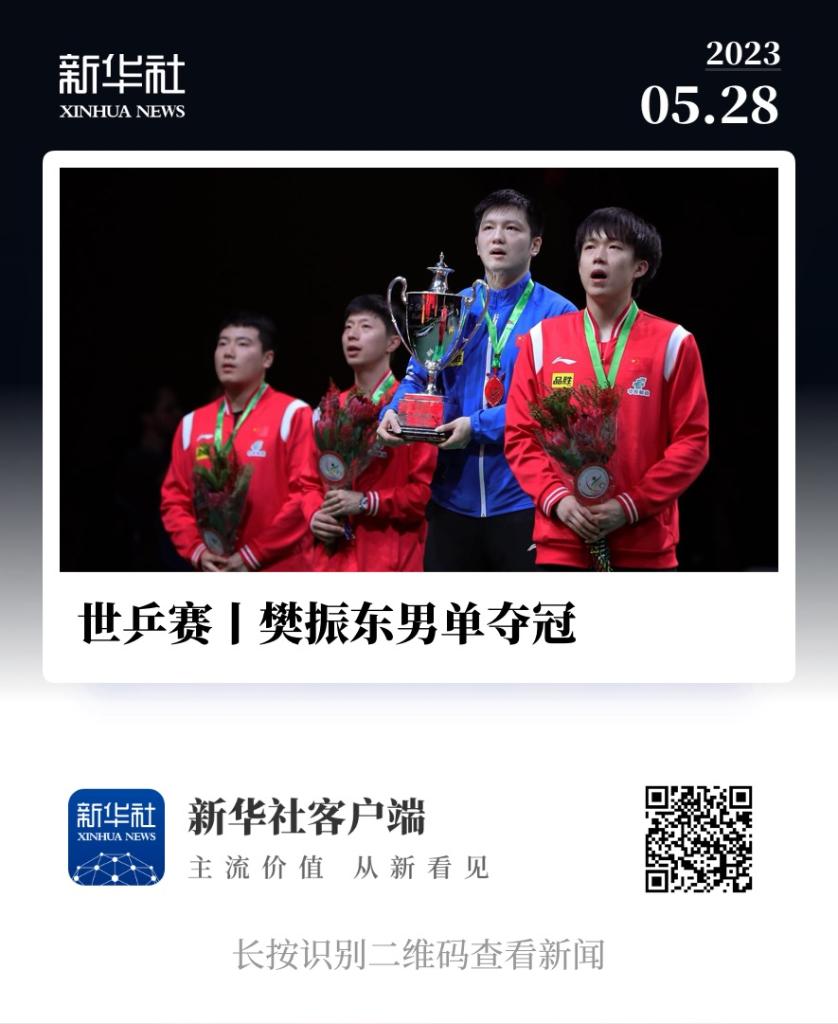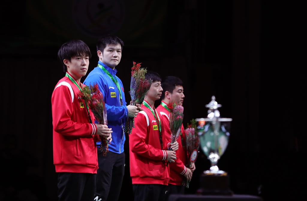 ↑2023年5月28日,冠军樊振东(左二)、亚军王楚钦(左一)在颁奖仪式上。当日,在南非德班进行的2023年世界乒乓球锦标赛男子单打决赛中,中国选手樊振东以4比2战胜队友王楚钦,夺得冠军。