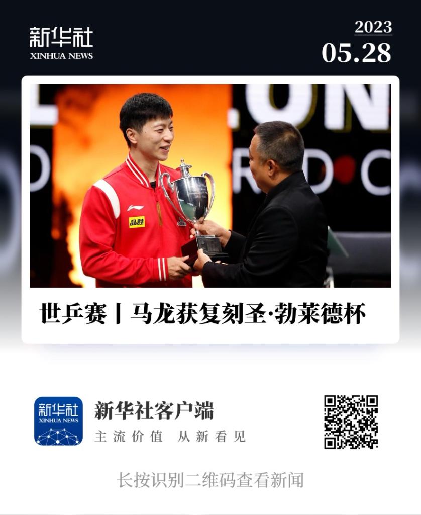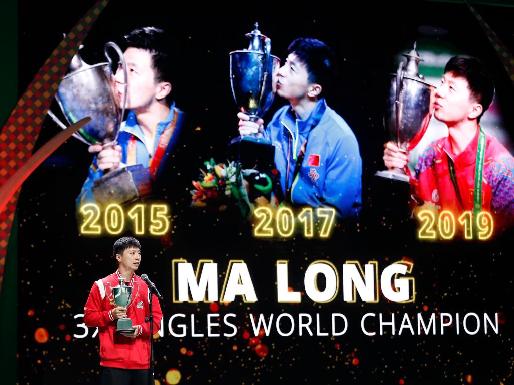 ↑2023年5月28日,马龙在获颁复刻圣·勃莱德杯后致辞。5月28日是南非德班进行的2023年世界乒乓球锦标赛的最后一个比赛日,国际乒联第一副主席、WTT世界乒联董事会主席、中国乒协主席刘国梁为中国选手马龙颁发复刻圣·勃莱德杯,以表彰他连续三届夺得世乒赛男单冠军。马龙于2015苏州世乒赛、2017杜塞尔多夫世乒赛以及2019布达佩斯世乒赛上夺得男单项目三连冠。