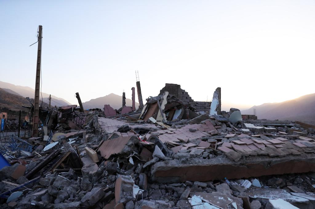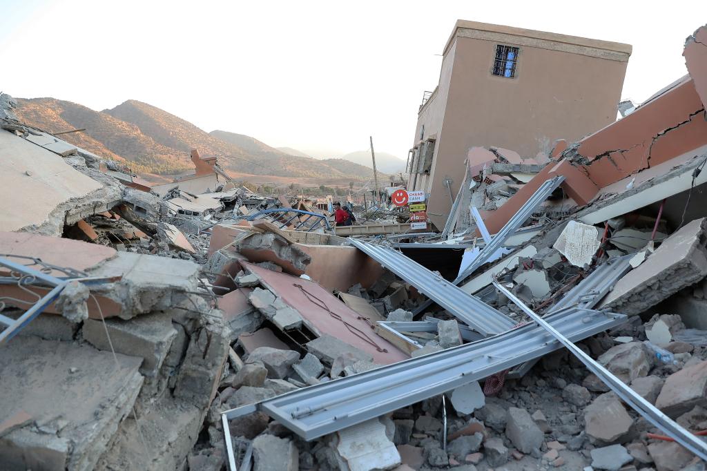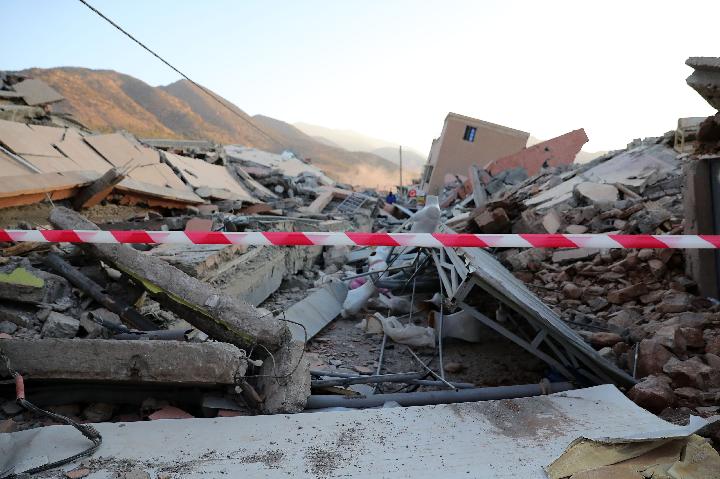 ↑2023年9月12日在震中区域的摩洛哥豪兹省塔拉特恩雅库布村拍摄的大量被地震损毁的建筑。