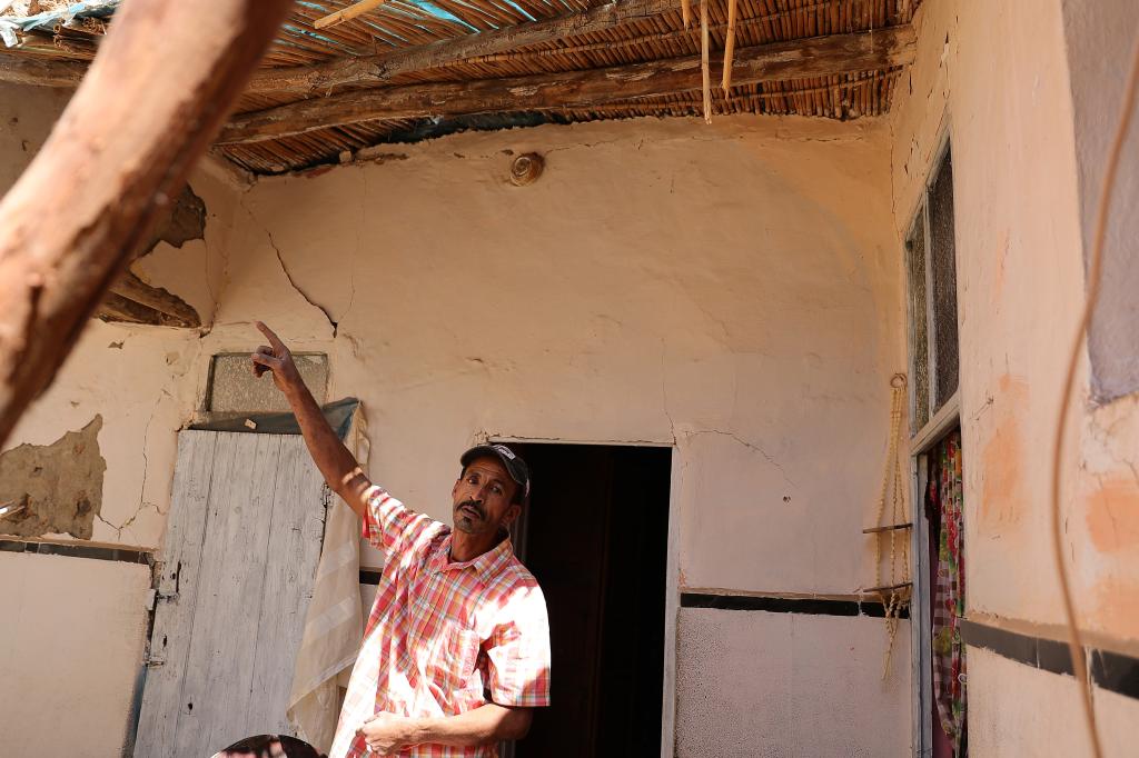 ↑2023年9月10日,在摩洛哥震中附近的艾米兹米兹村,一名男子查看受损房屋。