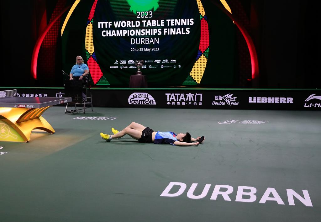 ↑2023年5月28日,孙颖莎在获胜后倒地庆祝。当日,在南非德班进行的2023年世界乒乓球锦标赛女子单打决赛中,中国选手孙颖莎以4比2战胜队友陈梦,夺得冠军。