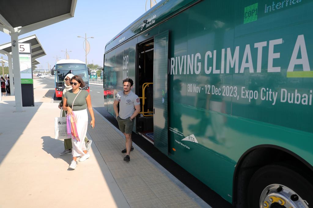↑2023年12月3日,在联合国气候变化迪拜大会的摆渡车停靠点,人们从中国苏州金龙公司的海格电动巴士下车。