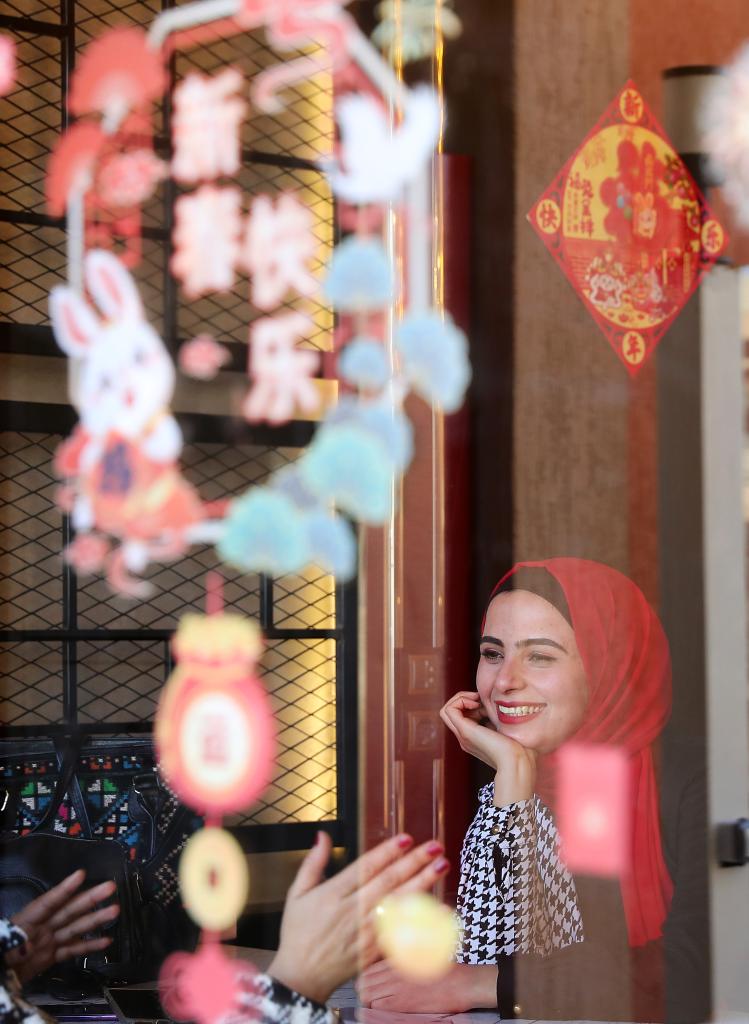 ↑2023年1月18日,一位顾客在位于埃及首都开罗的一家烘焙坊内感受中国春节氛围。临近中国农历春节,这家烘焙坊推出兔年春节主题装饰与商品,增添节日气氛、吸引消费者。