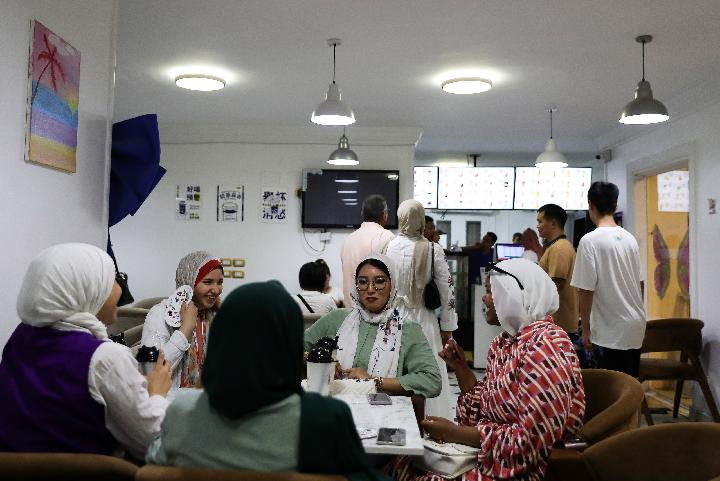 ↑人们在埃及开罗的一家中国奶茶店喝奶茶、休闲聊天。(2023年7月23日摄)